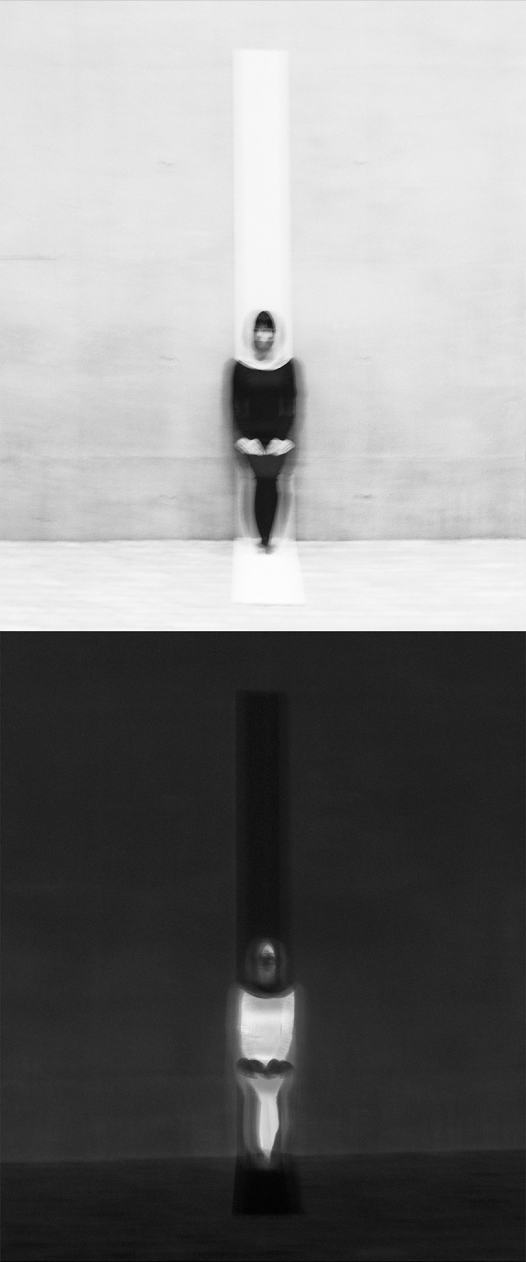 A position from the choreographic piece Bretter (Reinhild Hoffmann, 1980) that explores movement tensions in the still body is re-staged as an endurance performance whose length is "measured" by the photographic camera. The performer seems still but internal movement, the tension graduating in her body, is slowly bringing an end to the stillness.