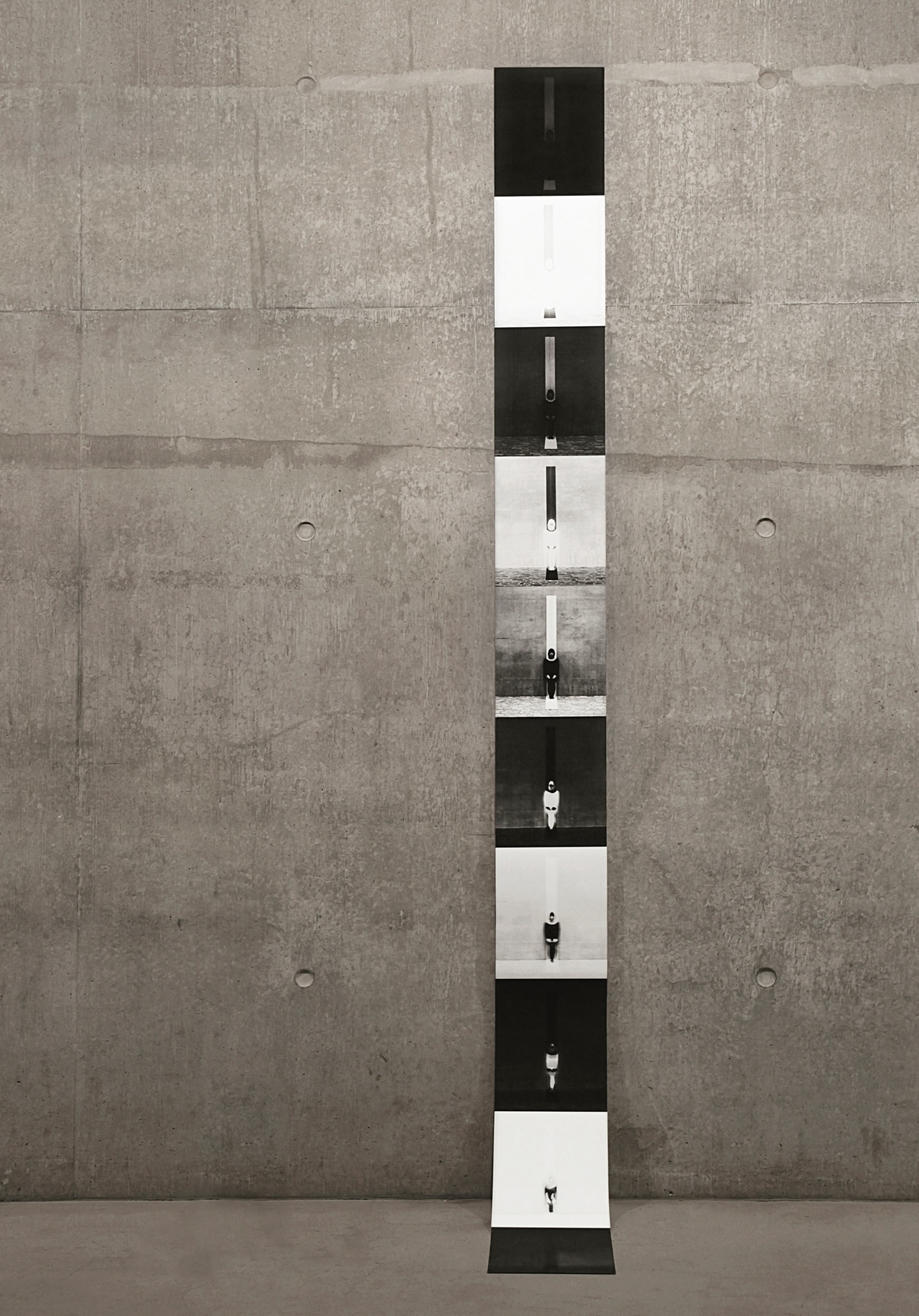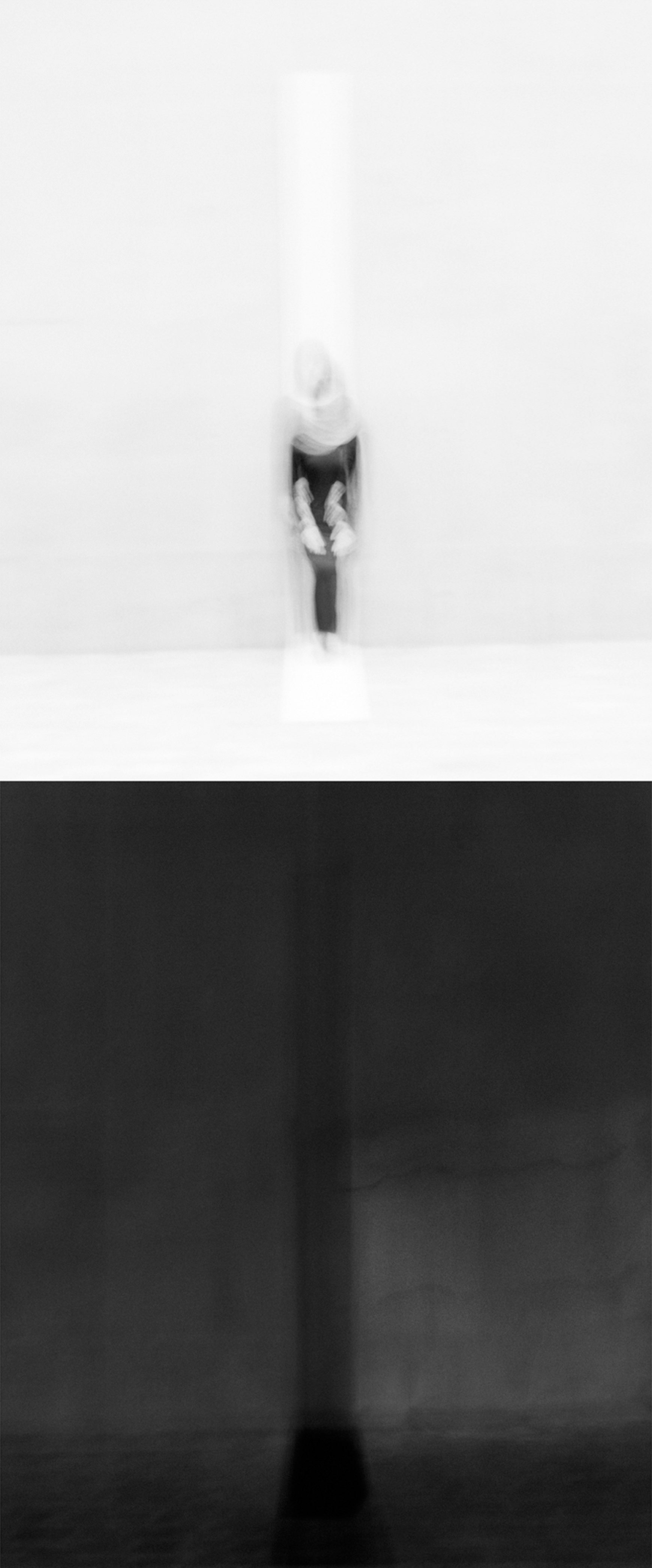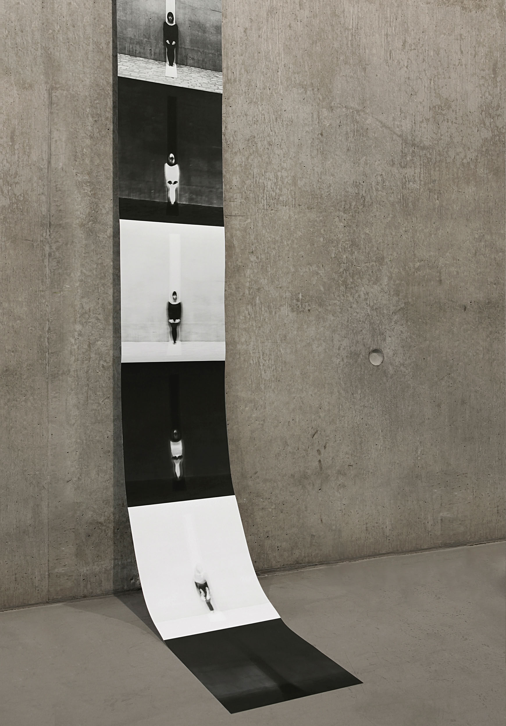 A position from the choreographic piece Bretter (Reinhild Hoffmann, 1980) that explores movement tensions in the still body is re-staged as an endurance performance whose length is "measured" by the photographic camera. The performer seems still but internal movement, the tension graduating in her body, is slowly bringing an end to the stillness.
